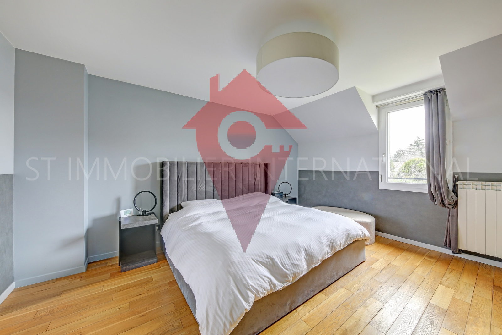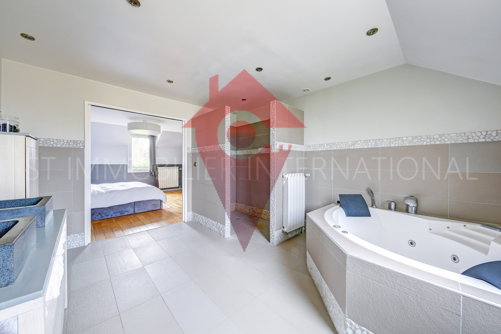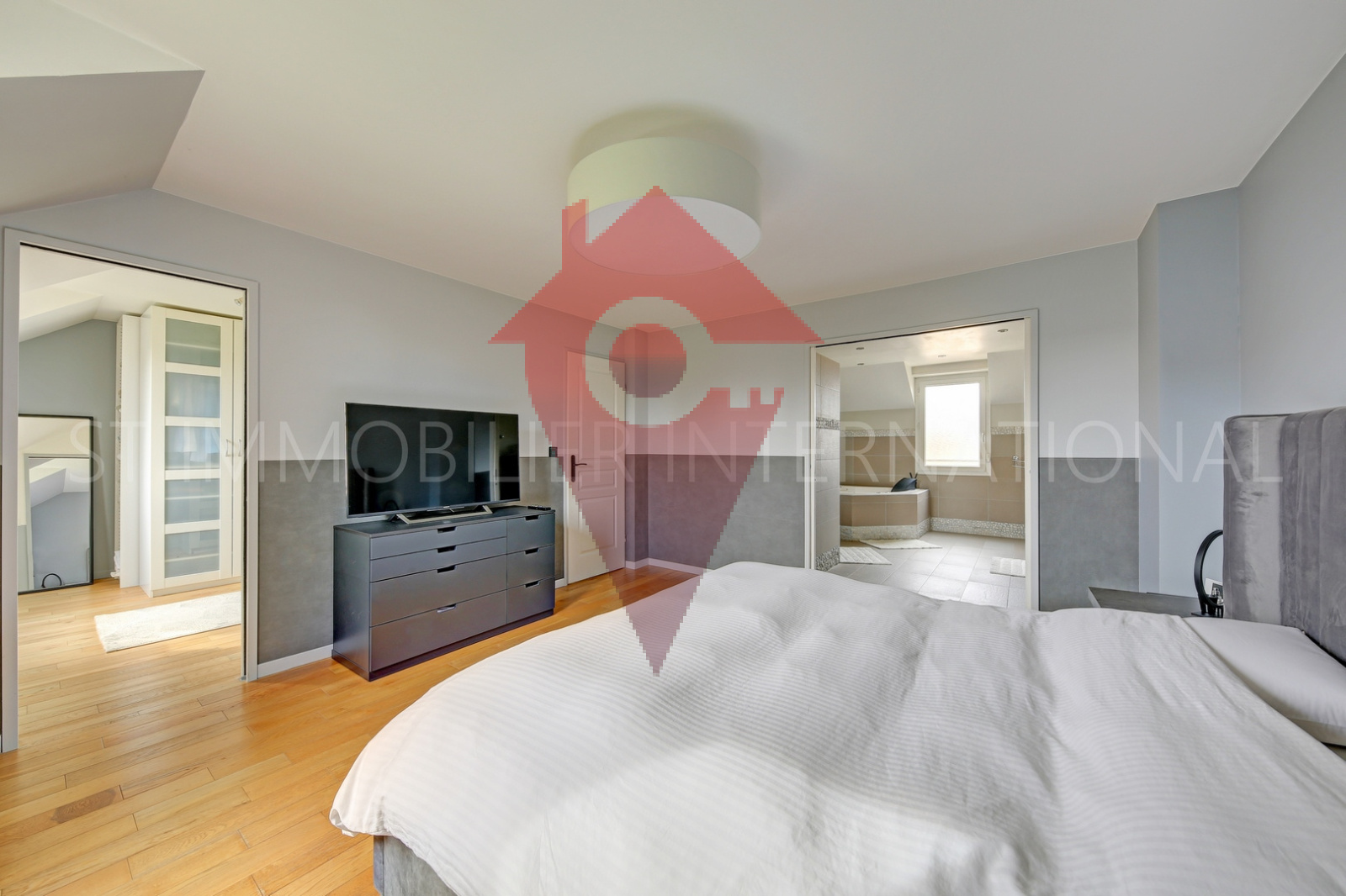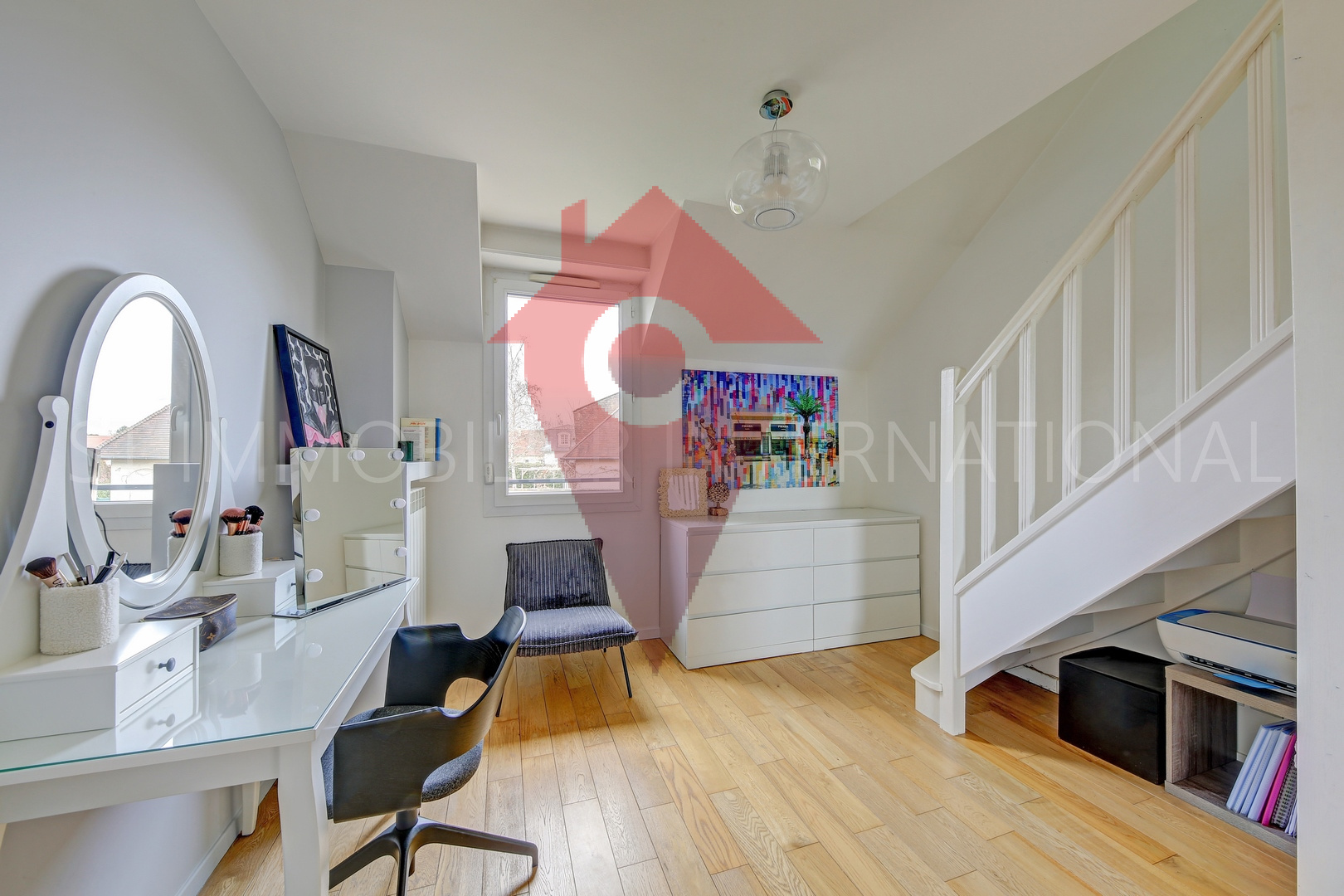 Au 1er étage, un palier dessert 2 chambres dont une avec salle de bains attenante, un dressing, une autre pièce d'eau, wc et une pièce bureau avec accès aux combles dans lesquels se trouvent 2 chambres (dont une petite), une pièce de jeux.